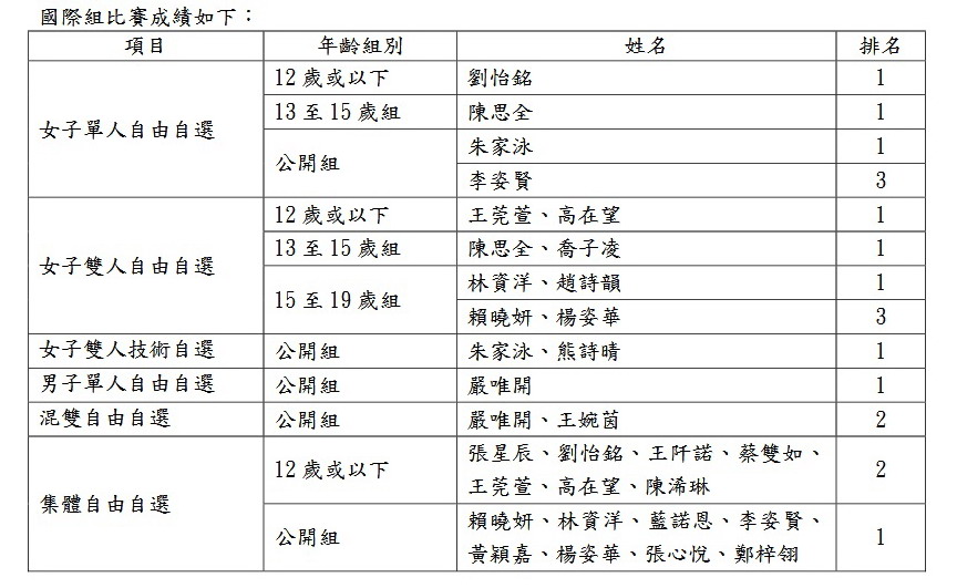 是次賽事首次增設男子單人自由自選及混雙自由自選項目,標誌着韻律泳運動邁向更全面發展。香港隊首次派出男子選手參加個人項目,即勇奪冠軍殊榮!混雙自由自選項目亦表現出色,獲得一面銀牌。三日賽事中,香港隊共取得九金二銀二銅的卓越成績,令人鼓舞。